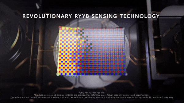 余承东在现场介绍,P30系列世界首次用了RYYB红黄黄蓝滤光阵列组合,白色是绿光和红光的结合,进光量提升70%,感光元件比其他同类产品大125%尺寸,跟上一代相比,P30系列的光圈也从1.8提升到1.6,暗光拍照更强。