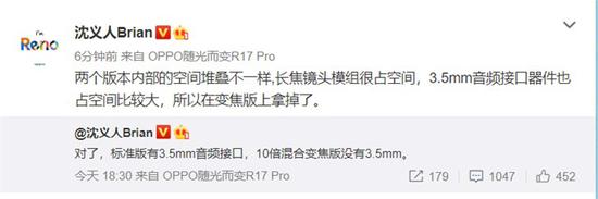 此前,OPPO副总裁@沈义人Brain 表示,OPPO Reno标准版有3 5mm音频接口,10倍混合变焦版没有3 5mm音频接口。刚刚,沈义人给出了OPPO Reno